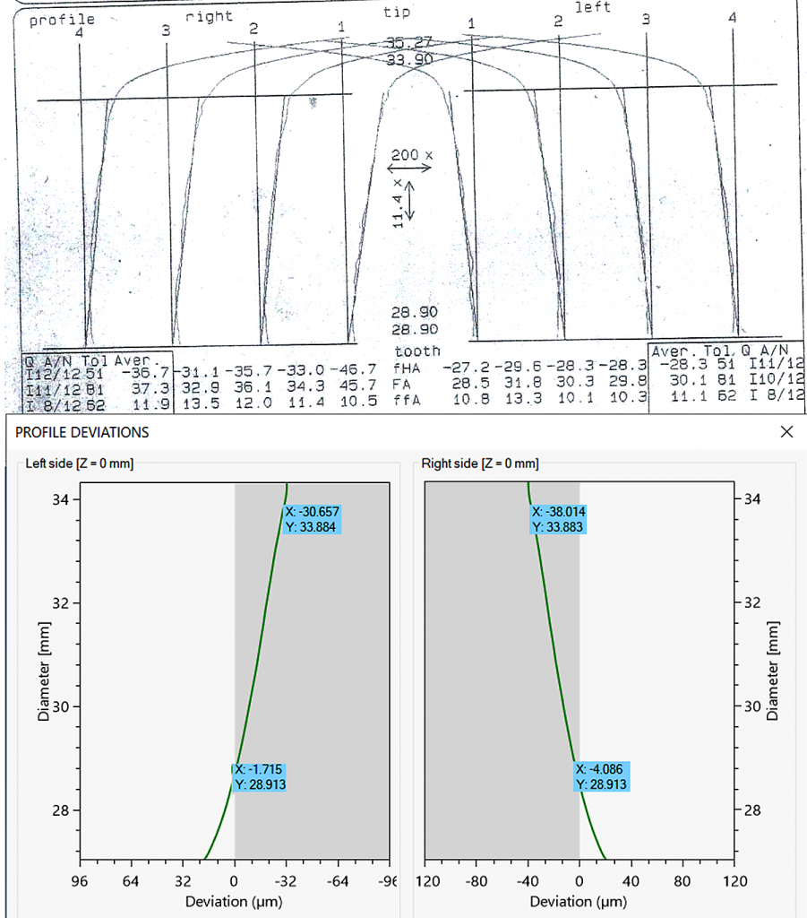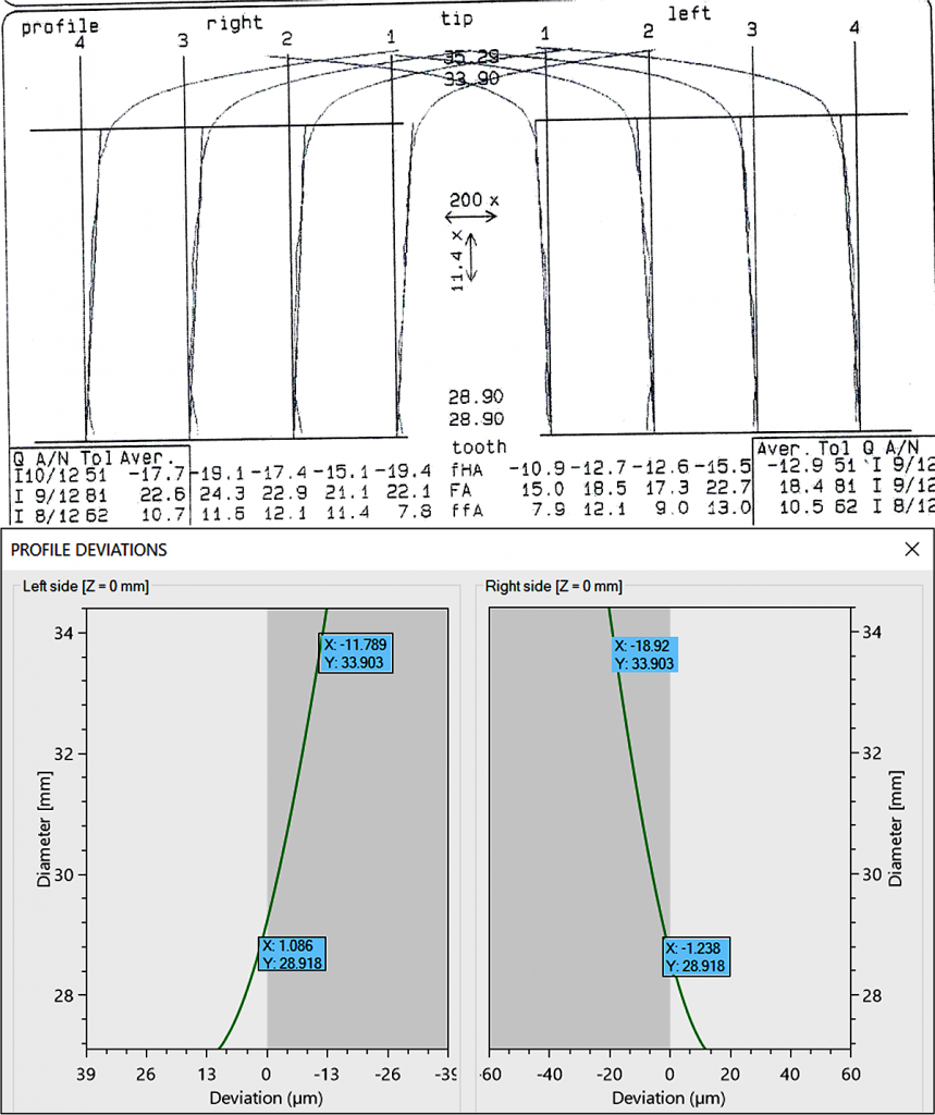 Variations in the tooth surface that influence gear noise and transmission error were also measured on four teeth and input into the pre-heat-treatment model. Figure 2 shows the measured profile deviations (fHA) with the IGD profile definitions defined; the right flank averaged 17.7 µm and the left 12.9 µm, with about a 5 µm range on each side.