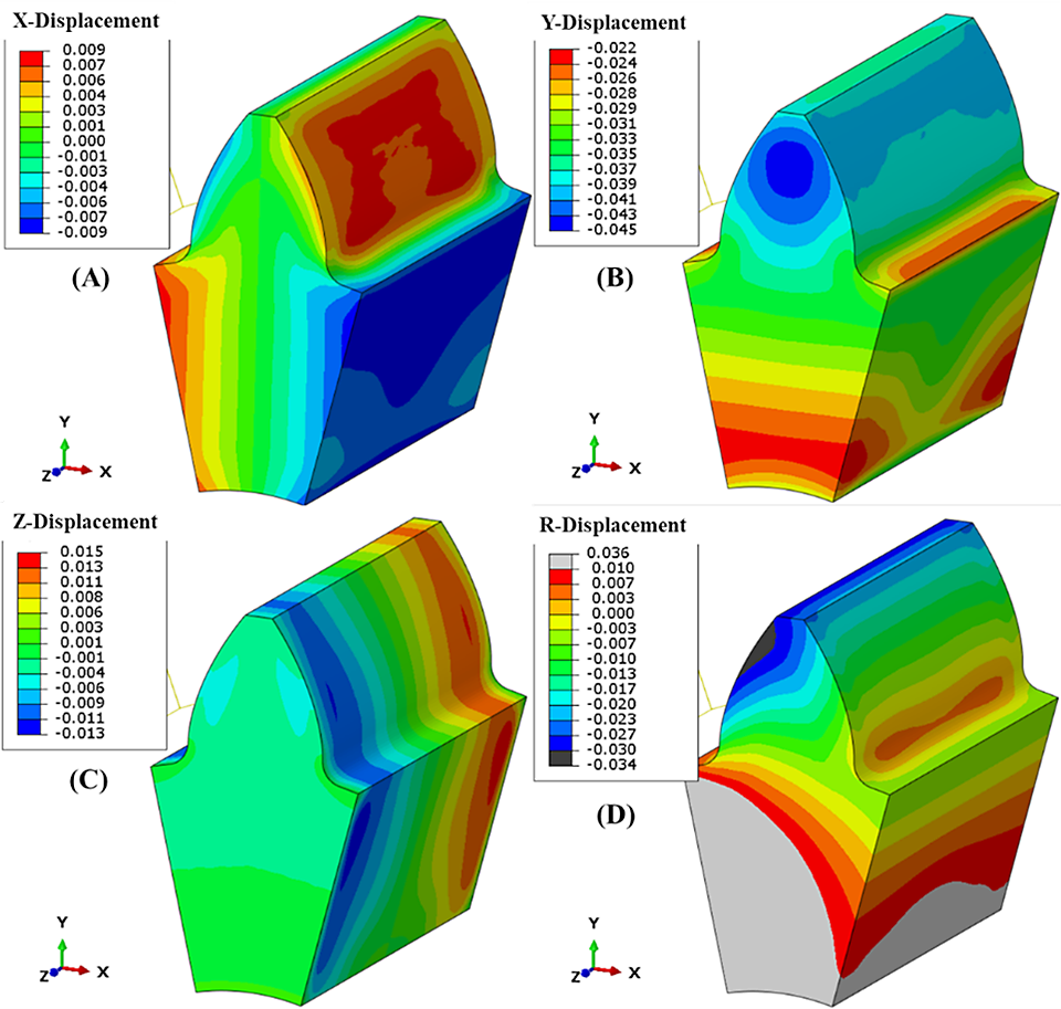 The DANTE model predicts several common heat-treatment results including hardness, carbon profile, phase composition, residual stress, and distortion. While hardness and stress predictions align naturally with laboratory data, distortion has been harder to validate in the same manner as a CMM would measure. The method of integrating IGD and DANTE allows the 3D displacement results to be directly compared to the measurable inspection data. Figure 4 shows DANTE’s displacement predictions along the X (a), Y (b), and Z (c) axes, while Figure 4 (d) transforms these into radial coordinates. The nodes on the flank surface can be directly plotted for comparison of the flank deviations, but this would need to be automated on a case-by-case basis, which is time/cost prohibitive.