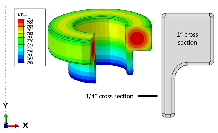 Simulation can provide more information about the overall temperature gradient in the part going into quench, including for different transfer times, capturing the effect of process consistency. This allows heat treaters to explore the interaction between material hardenability and processing conditions, helping to improve their understanding of their specific process. Low alloy parts, with thin cross sections, become especially sensitive to the timing of the transfer step. Due to their low hardenability these parts may start transforming from austenite to diffusive phases before getting to the quench, reducing their mechanical performance. Figure 1 shows an example part consisting of a one-inch cross section for the body and a quarter-inch cross section for the webbing. The figure also includes a temperature contour showing how the different sections would cool differently during air transfer.