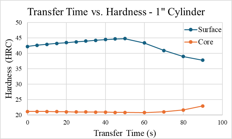 The hardness results for the one-inch cylinder models with transfer times starting at zero seconds (no transfer step) up to 90 seconds are shown in Figure 2. The results show the surface hardness of an integrated transfer of zero seconds of transfer time to be about 42.3 HRC, and the core hardness of 21.2 HRC. As transfer time increases, the surface hardness of the cylinder also increases, non-intuitively, until about 50 seconds of transfer time when the surface hardness reaches its peak of nearly 45 HRC (44.8 HRC).