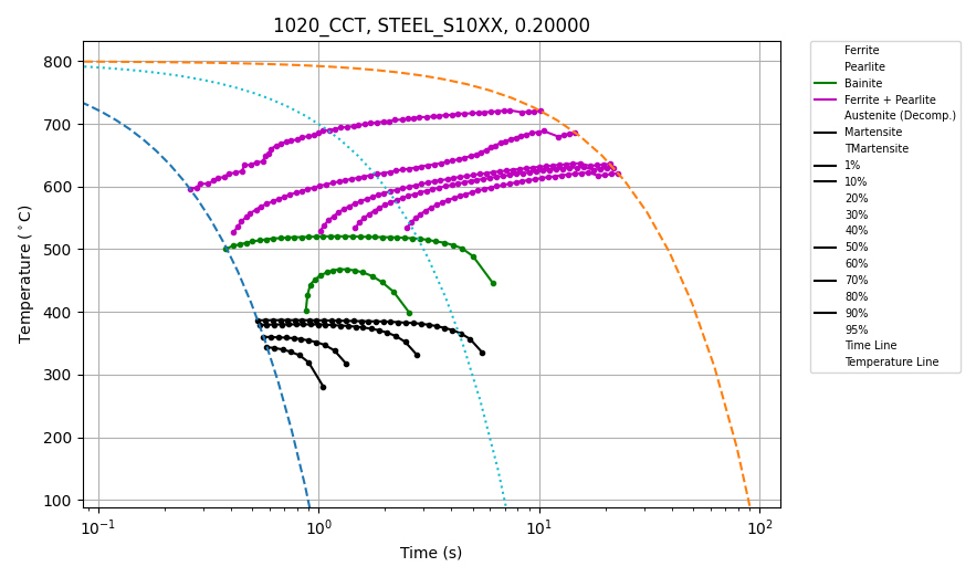 Longer transfer times produce more ferrite, reducing the surface hardness. For the core of the cylinder, the hardness remains relatively constant until the transfer time is sufficient to remove enough heat that the core can transform to phases other than ferrite and pearlite, such as bainite or even martensite, increasing the core hardness at the expense of surface hardness. Figure 3 shows a continuous cooling transformation (CCT) diagram of 1020 steel generated from the DANTE material database illustrating the phases that can be developed during different rates of cooling.