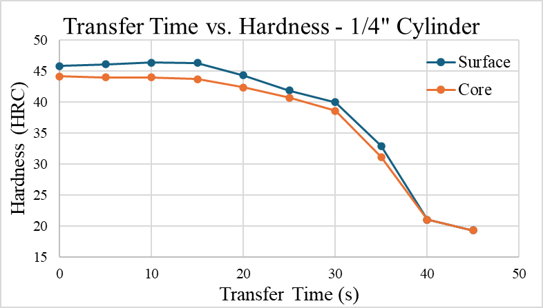 Compared to the one-inch cylinder, the thin cylinder section is much more sensitive to transfer time. The one-inch cylinder model showed an increase in surface hardness up to 50 seconds, while the thin section cylinder hardness was already severely reduced after 20 seconds of transfer time. With parts that include thin and thick sections, the transfer time consistency becomes an increasing concern to balance these regions.