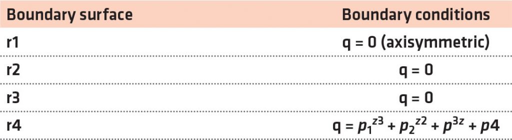 The Fourier axisymmetric heat conduction equation governs quenching heat transfer in the Inconel probe given by Equation 1, where k is the thermal conductivity and depends on the temperature T and ρ and Cp are the density and specific heat of the material, respectively. Figure 3 provides the cylindrical coordinates for the probe of the heat-transfer model. As per Table 2, r1, r2, r3, and r4 are considered as the boundary conditions at the surfaces. Prior to quenching, the probe was heat treated to 860°C; therefore, at time t = 0, r(r, z) = 860°C. This was considered the foremost requirement for resolving the inverse heat conduction model. With the implementation of these boundary conditions, the finite element method was used to solve the Fourier heat conduction equation. The axisymmetric probe model of the rectangular cross-section was discretized into almost 6,000 rectangular elements having a mesh size of 0.25 × 0.25 mm2. The heat transfer at the interface between the metal and the quenchant was calculated by using the thermal properties of Inconel, and these properties have been used to determine the effectiveness of cooling achieved by aqueous polymer and brine solutions used for quenching. [11] As per Table 2, the bottom and top surfaces of the probe are insulated, and r4 is the only boundary surface through which quenching heat transfer is expected to occur. The interface heat flux r4 is defined as a cubic function of distance z. The parameters p1, p2, p3, and p4 for the time step (ts) form the main calculation for the inverse problem (Equation 2). As per Ozisik and Orlande, [19] the conjugate gradient method was implemented to determine the parameters. The parameters were represented as Pts. [12] z varies between 0 and 70 mm.