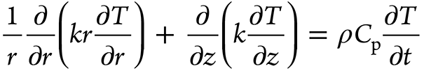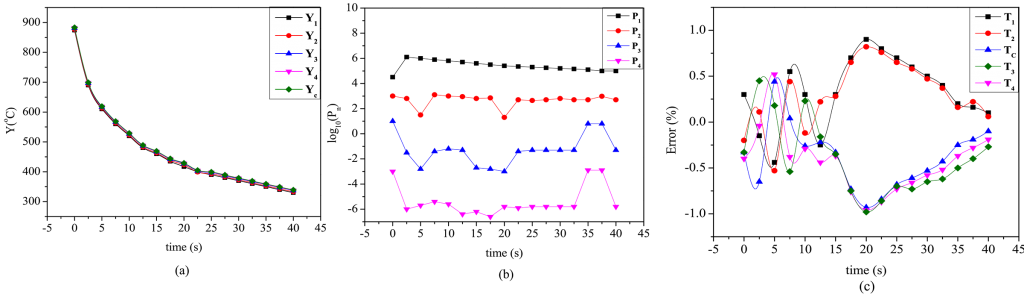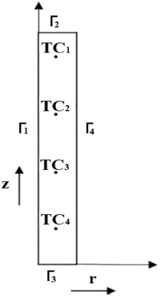 The thermocouple positions (r, z) TC1, TC2, TC3, and TC4 are (4.25, 7.5), (4.25, 22.5), (4.25, 37.5), and (4.25, 52.5), respectively. The temperatures measured at TC1, TC2, TC3, and TC4 are denoted as Y1, Y2, Y3, and Y4 respectively. The parameter values p1,ts, p2,ts, p3,ts, and p4,ts are determined to solve the inverse problem for which objective Sts was minimized (Equation 4).