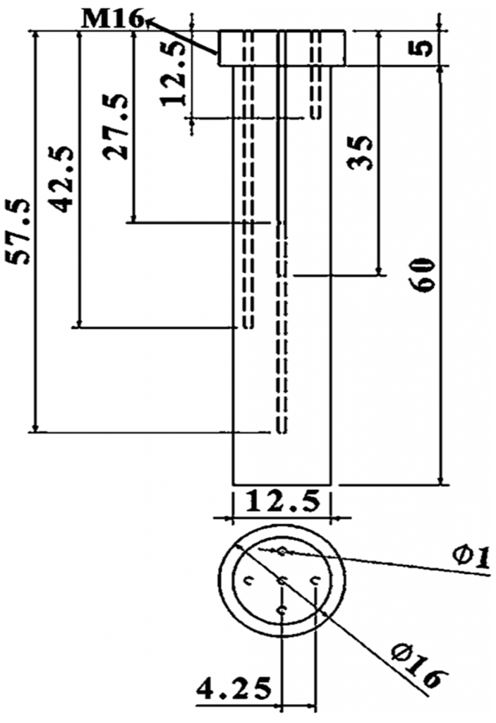 The effectiveness of the quenching medium’s cooling was assessed by adopting an Inconel probe crafted to the dimensions of 12.5 mm in diameter and 60 mm in height, respectively, with inbuilt thermocouples attached, as seen in Figure 1. The probe was perforated with five 1 mm diameter holes through electrolytic discharge machining (EDM). A single hole was created at the midpoint of the probe up to a depth of 35 mm, followed by the remaining four holes drilled radially to 5 mm, up to depths of 10, 25, 40, and 55 mm, respectively. All of these depths are threaded to 5 mm exclusively from the top of the probe.