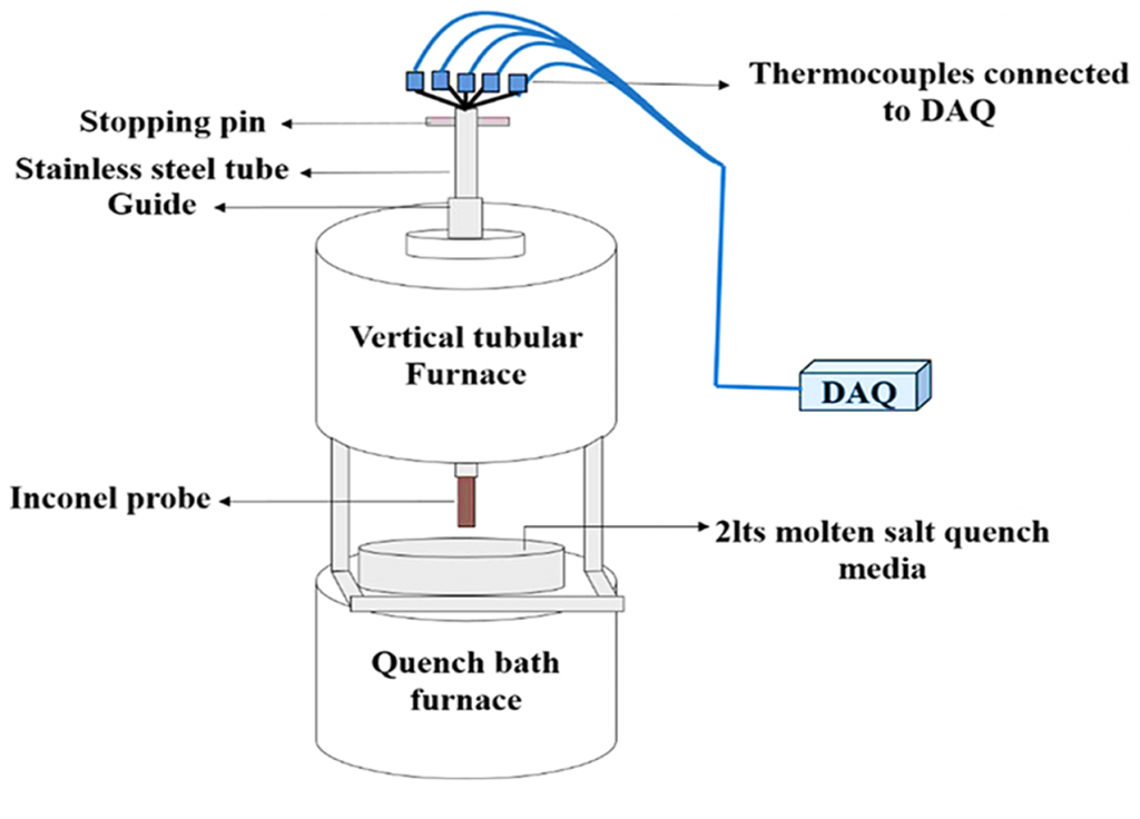 Precalibrated thermocouples of K-type were obtained from Phoenix Temperature & ElectroMech Manufacturing Co. WLL. Thermocouples, each of them having a measure of 1 m length, were placed into the EDM drilled holes using an 800 mm steel tube, reaching into the Inconel probe. The connection between the thermocouples and the tip of the hot junction was confirmed by manually applying pressure to fasten the thermocouple onto the surface of the measuring hole. It is assured that the press fit tolerance is upheld for the thermocouple and the EDM drilled holes so that the necessary connection between the metal surface and the junction of the thermocouple is not lost during experimentation. Figure 2 gives the complete representation of the experimental setup implemented for the quenching experiment. The Inconel probe, along with the thermocouples, are fastened to the stainless-steel tube. This tube is then moved to a vertical tubular furnace. A NI-9213 data logger was connected to the thermocouples using compensation cables. This data logger was connected to a computer, which recorded the time-temperature data. This data was recorded at the rate of 10 readings per second.