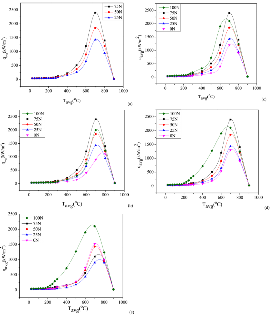Figure 5 displays the correlation between qavg and Tavg observed in the Inconel probe when it underwent quenching within molten Ca (NO3)2-KNO3 solutions preserved at varying bath temperatures. The commencement of boiling in the molten salt used for quenching signified the initial stage of heat absorption at the interface between the metal and the quenching medium. As shown in Figure 5a, qavg rapidly surged to a peak value of qmax equivalent to a Tavg of Tmax during the early quenching stage. Following that, the intensity of the heat flux diminished.