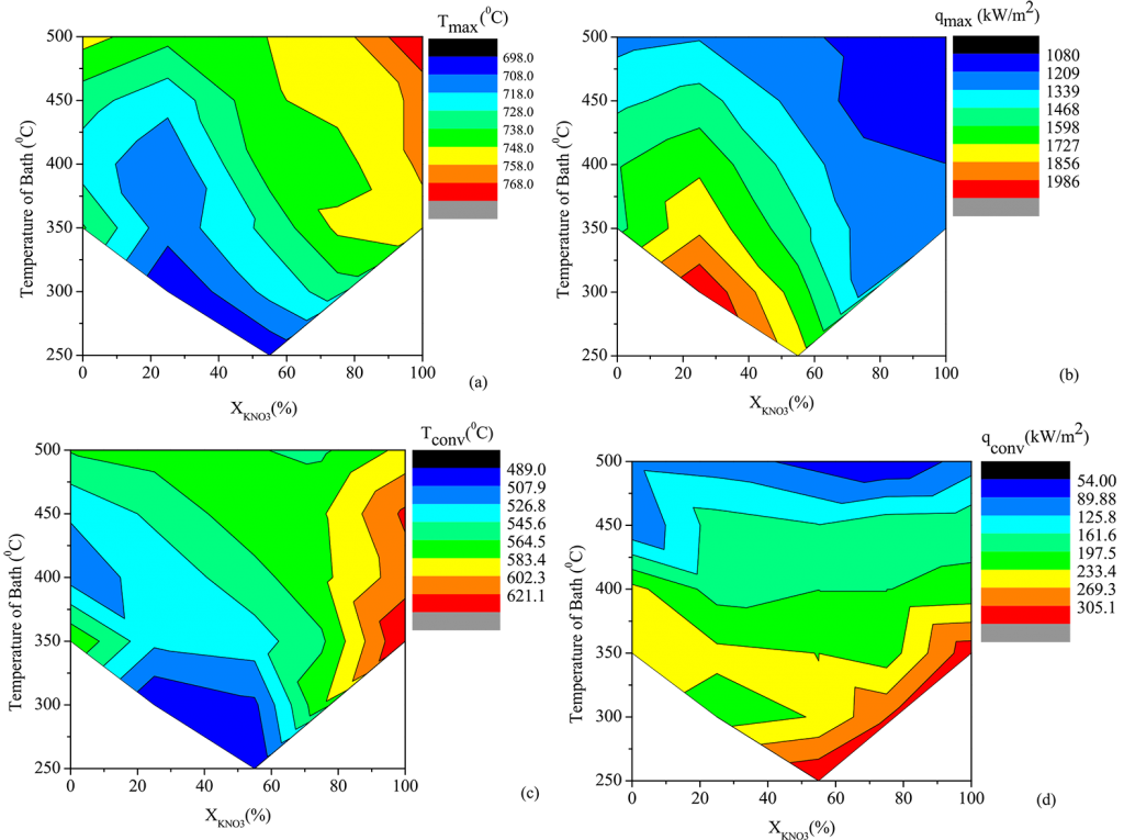 The maximum rate of heat removal throughout the nucleate boiling phase and the shift from nucleate to convective cooling were selected as the crucial stages to evaluate the quench media’s ability to cool down. [9] The terminologies qmax, Tmax, qconv, and Tconv have been used to describe the quench performance of molten Ca (NO3)2-KNO3 mixtures. Results from quenching experiments were used to construct Figure 6a-d. The data for all contour plots in Figure 6 are included in Table 3.