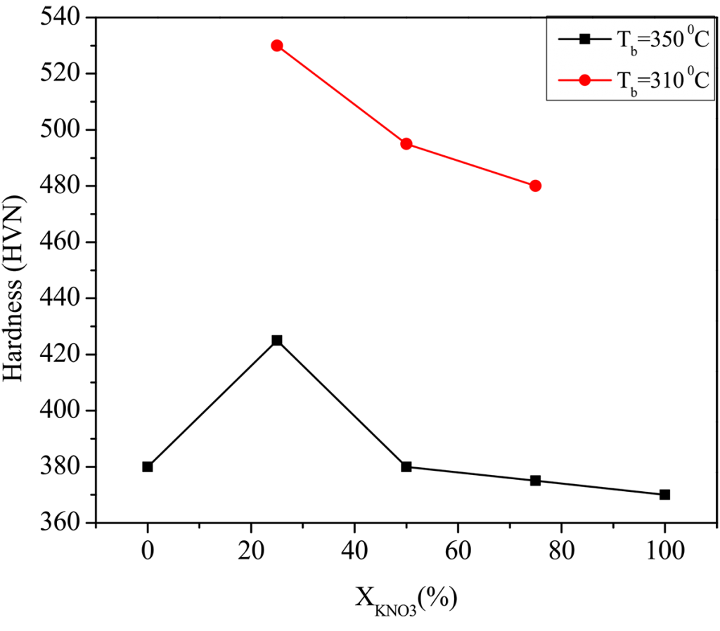 The variation of qmax significantly influenced the steel probe’s hardness quenched in a Ca (NO3)2-KNO3 mixture, which was maintained at 350°C. The early occurrence of the convective cooling phase restricted the benefits that could have been achieved due to high qconv at higher concentrations of KNO3 in the molten bath. This is unlikely to take place in the molten bath maintained at 310°C and is indicated by the higher values of Tconv.