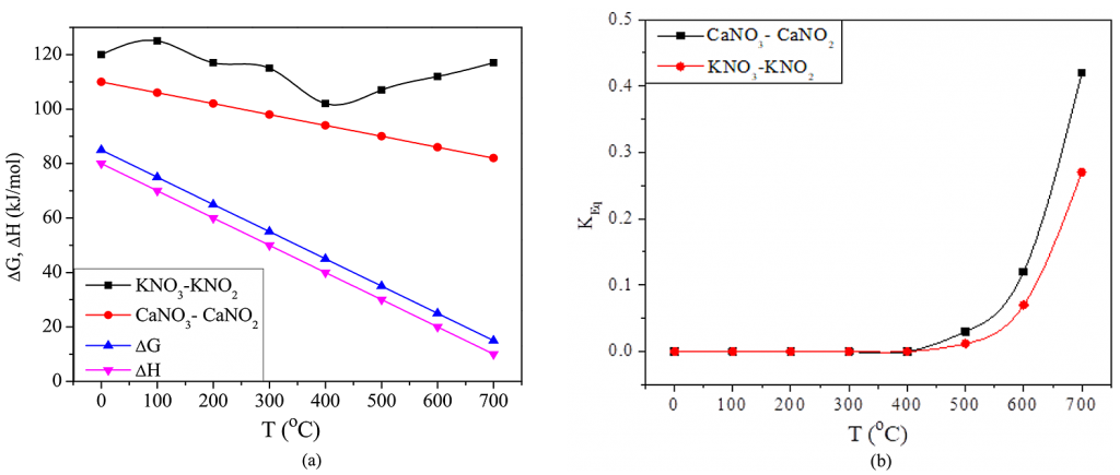 The variation in energy and enthalpy during the nitrite-nitrate reactions can be observed in Figure 9. Figure 9a shows the standard changes occurring in the decomposition of KNO3 were higher than that for Ca(NO3)2. Also, the decomposition of Ca(NO3)2 is more spontaneous than that of KNO3 for a given temperature. Due to this, the quenched Ca(NO3)2 eutectic mixture observes an extended boiling phase. As shown in Figure 9b, the equilibrium constant (Keq) for the decomposition of Ca(NO3)2 was higher than that of KNO3. All of this indicated that for a given temperature, the rate of decomposition, pressure, and surface temperature for Ca(NO3)2 was altogether higher than the KNO3 decomposition rate.