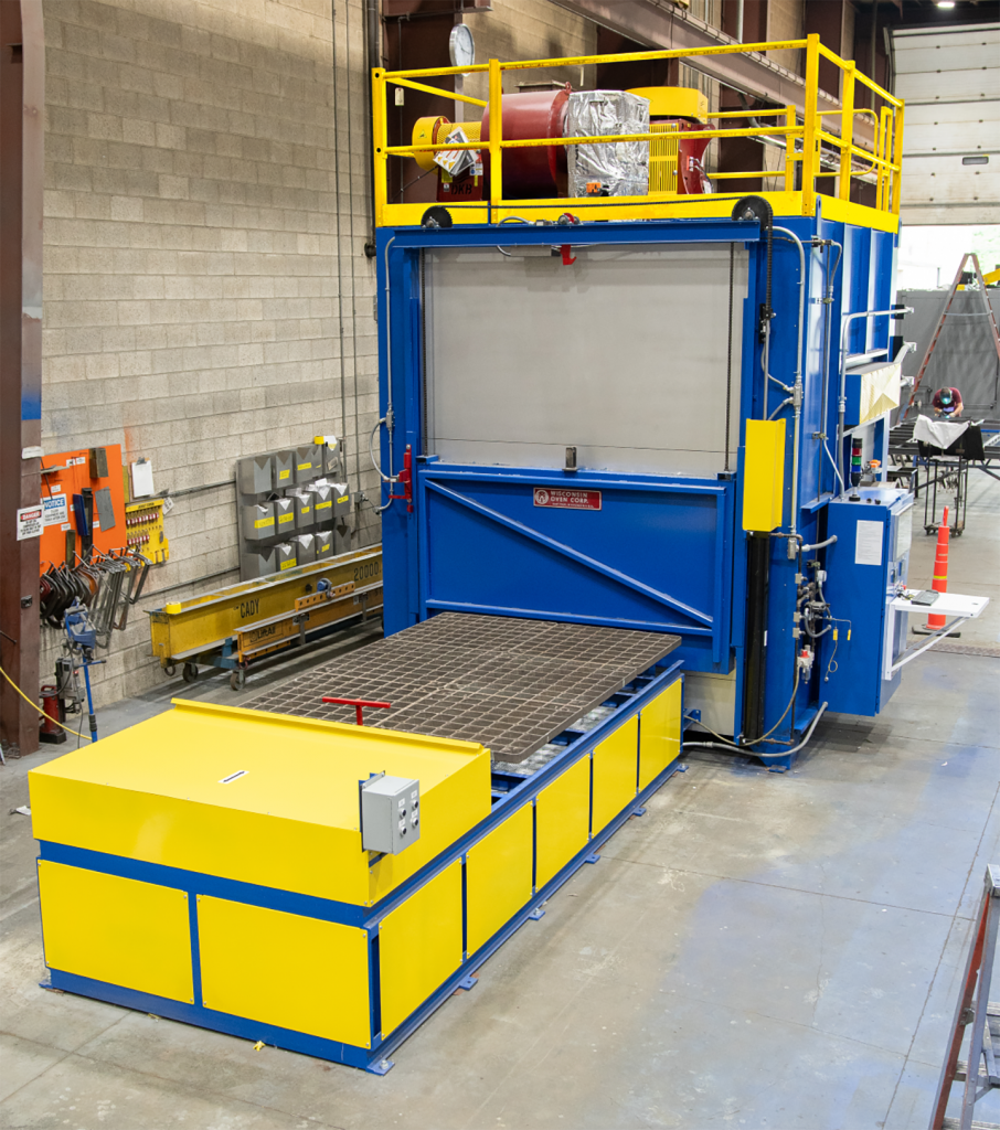 The oven is designed to heat and cool loads up to 1,200 pounds per cycle. Parts are placed on a high-strength grid and transferred into the 7’ wide x 10’ long x 3’ high work chamber by an automated pusher/extractor system. After processing, the load is extracted onto the load table where six high-speed fans direct ambient air upwards across the parts for further cooling.