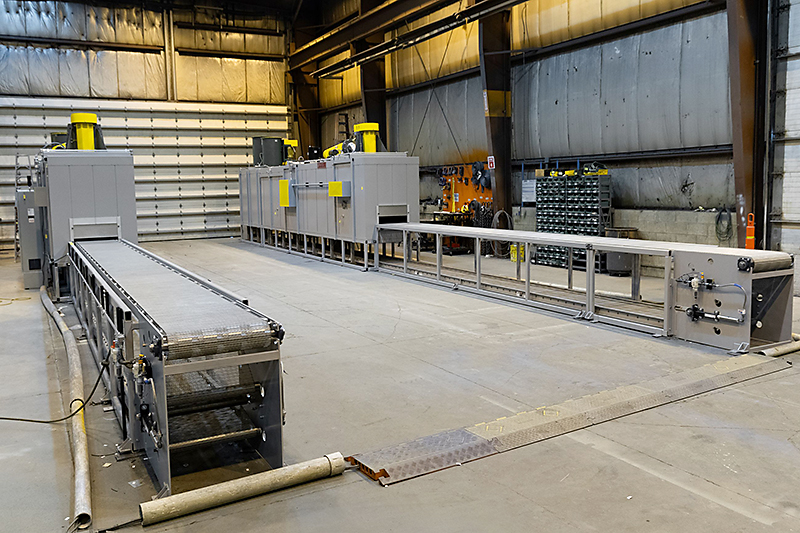The belt conveyor systems feature variable frequency drives which allow the operator the flexibility to adjust the conveyor speed as needed. The ovens use top-down airflow for efficient heat transfer and each zone is equipped with an 8,600 CFM recirculation blower. The entire heating and cooling processes are completed in less than an hour.