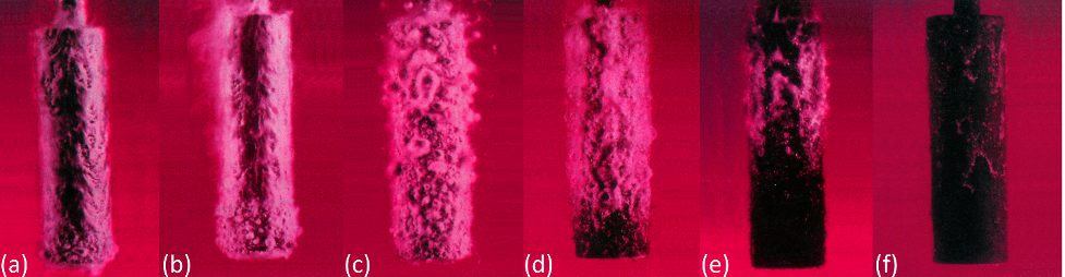 Figure 4: The quench sequence in a typical polymer quenchant: (a) immediately after quenching, a thick polymer film precipitates on the surface of the part; (b) after 15 seconds, the film becomes active; (c) after 25 seconds, the film ruptures over the entire surface; (d) after 35 seconds, boiling ceases and convection begins; (e) after 60 seconds, the polymer starts to re-dissolve back into solution, and (f) after 75 seconds, the polymer has practically re-dissolved back into solution and heat removal is completely by convection.