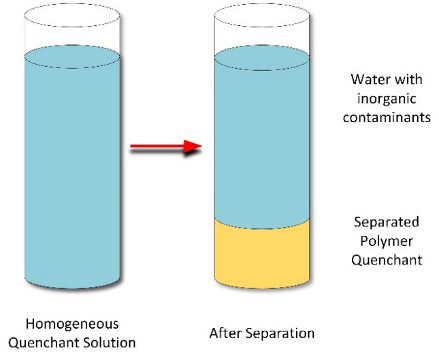 This mechanism of inverse solubility is limited to two polymer quenchant classes: PAG and PEOX. In these systems, as the temperature of the solution is raised, the thermal energy of the system becomes greater than the energy of the hydrogen-bond interactions with water. When this occurs, a two-phase system develops, with one layer being water-rich and the other a polymer-rich layer (Figure 5). This is not a clean separation as both phases have some of the other components. The temperature at which this separation occurs is called the cloud point. In PAG quenchants, the ratio of the monomers used to produce PAG quenchants control the cloud point. In this case, the cloud temperature decreases as the propylene oxide monomer proportion increases.