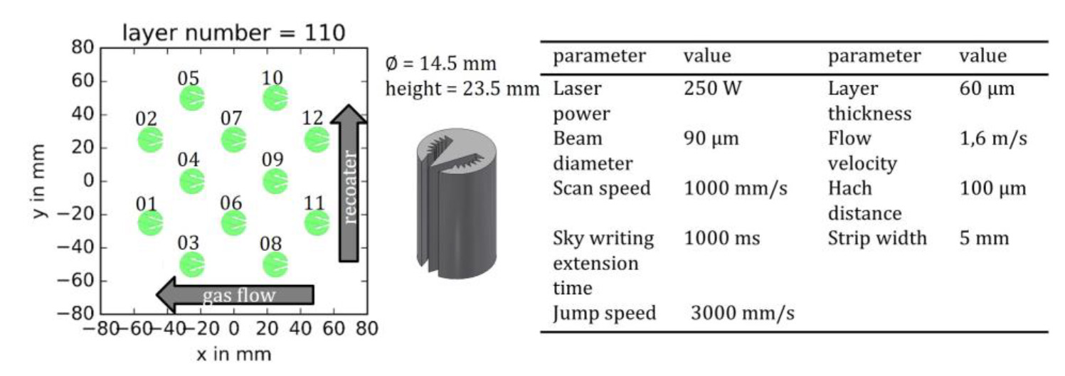 The build platform is preheated to a temperature of 100°C to produce the test specimens. The process parameters used for production are listed in Figure 1. The samples are exposed in sequence (part 1 to 12) against the inert gas flow in order to reduce the influence of spatter. A meandering stripe hatching is used as the exposure strategy, which is rotated by 33° layer by layer. Vector directions with an angle of less than 45° to the shielding gas flow are omitted in order to reduce the interaction of the laser beam with the metal vapor, cf. [14].