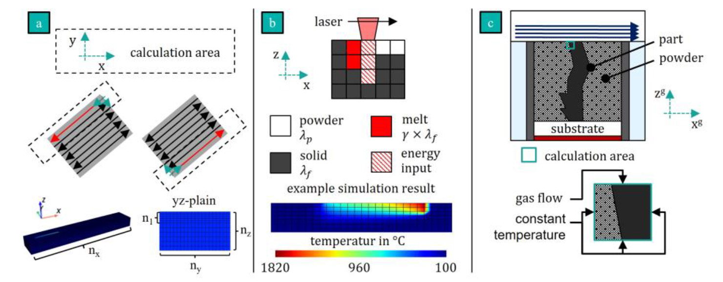 Figure 2a shows an example of the calculation area for different vectors. The simulated scan vector is shown in red. The size of the calculation area depends on the length of the exposure vector. The origin of the calculation area is always at the starting point of the exposure vector, while the exposure direction is the X-axis of the calculation area. This means the calculation area rotates relative to the part depending on the orientation of the exposure vector. The advantage of the described calculation area is that the meshing only has to be carried out once, as the meshed grid is only shifted or rotated. A structured grid with different element sizes in the Z-direction is used for meshing.