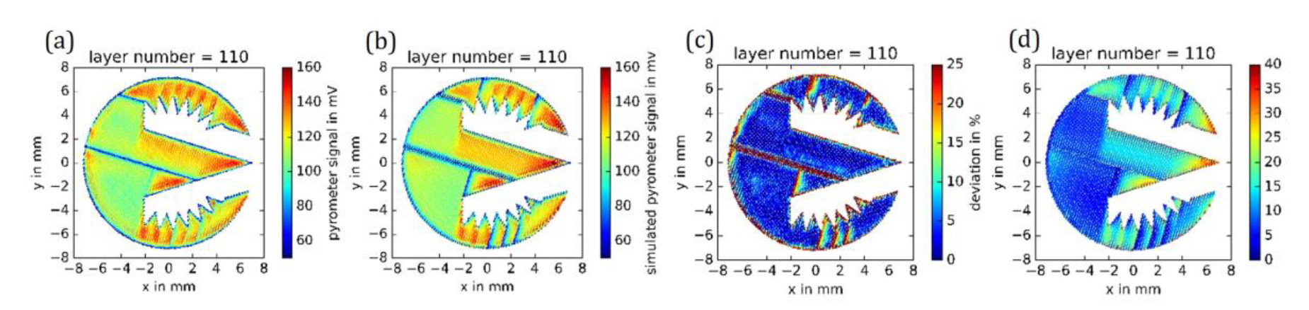 This output value field is then multiplied by the emissivity of the material and divided by the emissivity set on the pyrometer (see section 2). The sum of the output values gives the predicted signal of the pyrometer. Two emissivity values are used to predict the thermal emission, the first for temperatures below 1,000°C and the second for temperatures above 1,000°C. To determine the emissivities, both emissivities are varied in a range from 0 to 1 for the prediction of the emission of 15 layers and the deviation from the measured signal is determined. The combination of emissivities that results in the smallest deviation is used to predict the thermal emission. To calculate the deviation between the predicted and measured signal, the emission of all built-up samples is averaged and reduced to the resolution of the simulation. To reduce the resolution, the measured values within an element are averaged.