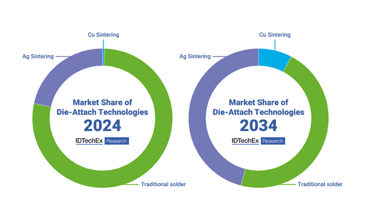 Figure 1: Market share of die-attach technologies for 2024 and 2034. (Courtesy: IDTechEx – “Thermal Management for EV Power Electronics 2024-2034: Forecasts, Technologies, Markets, and Trends”)