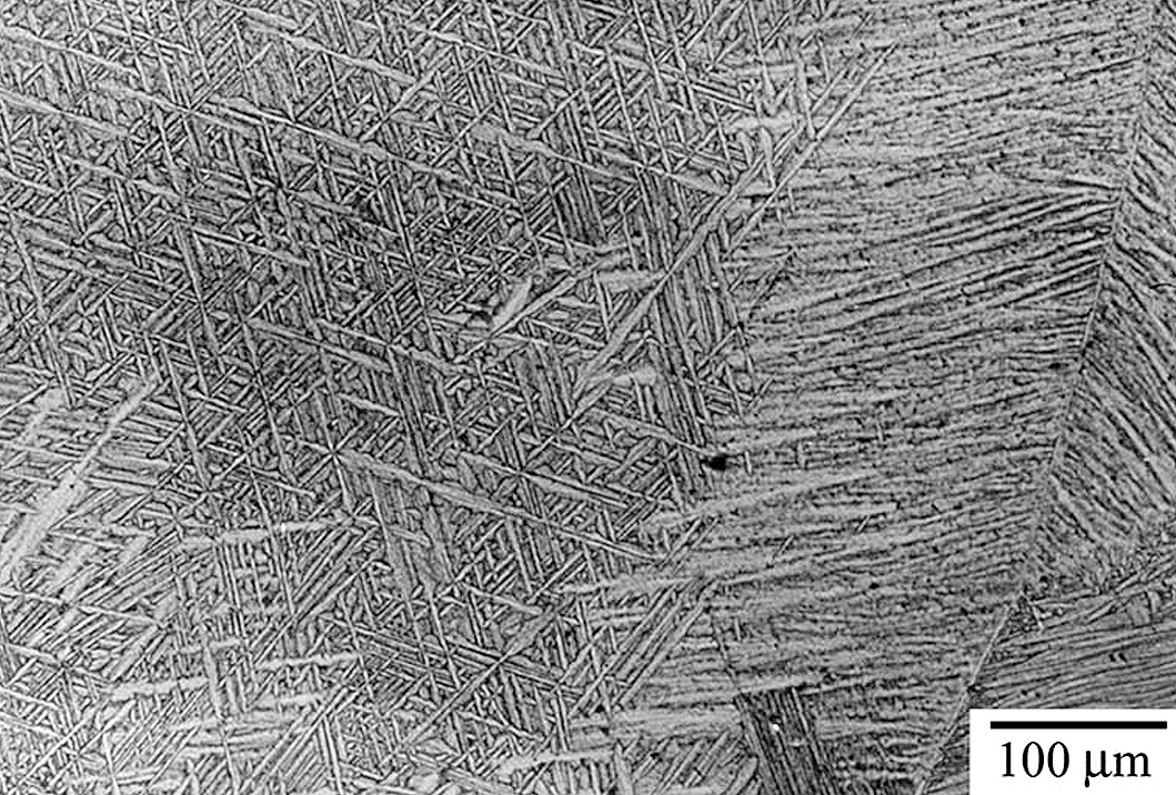 Figure 1: Ti-6Al-5Zr-0.5Mo-0.25Si heat treated to 1,050°C and slowly cooled to ambient temperature. Showing Widmanstätten α within prior β grains [1].